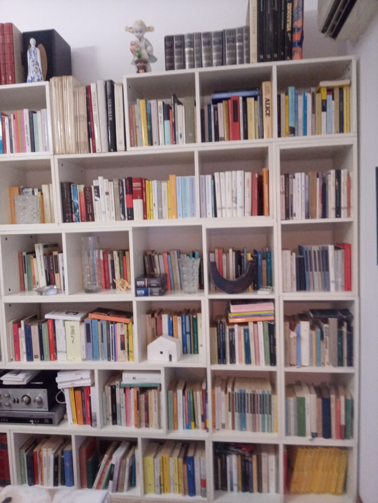 Qualche anno fa abbiamo studiato e approssimativamente realizzato, un riordino globale di tutti i libri, suddividendoli al meglio nei diversi spazi a disposizione. La libreria in soggiorno, arte e narrativa, quella in studio, riservata alla poesia, le quattro in taverna, saggistica, hobbies-natura-sport, lingue straniere, allegati alla stampa. Più o meno.
