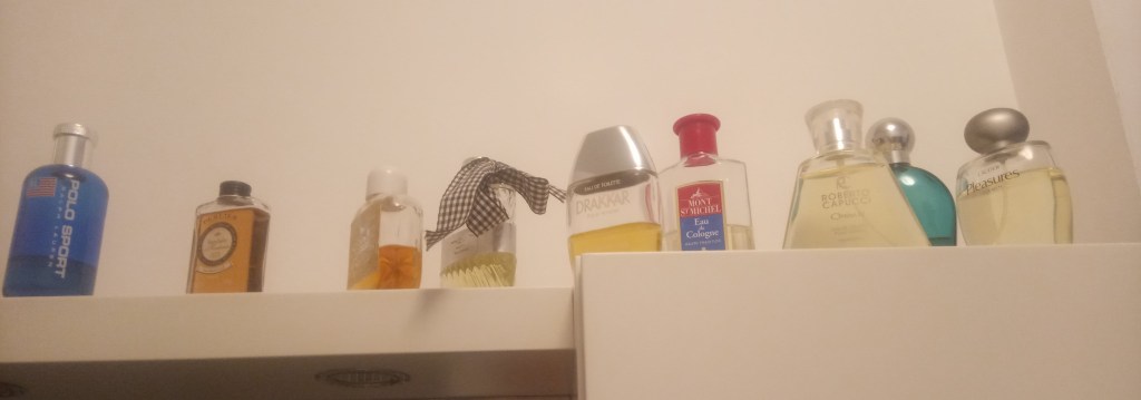 C’è stato un solo periodo della mia vita durante il quale ho usato abitualmente profumo, sarà stato attorno agli anni ’80, mi ero innamorato di un profumo che si chiamava Borsalino, caro come il fuoco, che mettevo addirittura anche di giorno. Poi mi è passata e hanno smesso di produrlo, forse ero il loro più grande consumatore. Sì dai, scherzo! Dopo di allora ho messo profumo solo di sera, in occasioni particolari, spesso romantiche, come gesto di attenzione per la mia compagna del momento. Qualcuno di quei flaconi era il ricordo di una storia passata, altri regali di vecchie simil zie che non sapevano proprio che cos’altro regalarmi, di altri non ricordo l’origine. Credo che almeno un paio fossero il risultato delle mie attitudini di cuculo; avendo occupato il nido che qualcuno aveva abbandonato avevo poi portato via con me tracce del precedente occupante. D’altronde una signora non può mettere profumo da uomo, soprattutto di un suo ex, e mica si può buttare via.